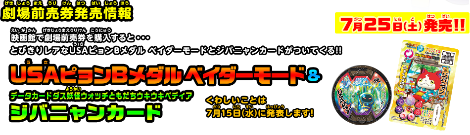 そして気になる前売り情報も明らかにされている。7月25日(土)より劇場前売券を発売する。前売券をの購入すると、「USA(うさ)ピョンBメダル ベイダーモード」と「データカードダス妖怪ウォッチともだちウキウキペディア ジバニャンカード」のセットが付いてくるのはファンには見逃せない情報だろう。