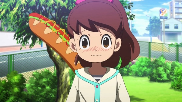 巨大なホットドックを食べようとするフミちゃんを発見するケータ。
