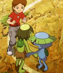 妖怪ウォッチ・第33話「ホンモノはどっちだ!?」 31~40話 2014年08月31日 0 妖怪ウォッチ・第33話の二本目は「ホンモノはどっちだ!?」です。 今回は古典妖怪の河童が登場します。果たしてノガッパの立場はどうなってしまうのでしょうか? 「ホンモノはどっちだ!?」あらすじ ケータの学校では地元のカッパ伝説にあやかり、授業の一環としてかっぱについて調べて発表することになった。 カッパといえば「妖怪ノガッパ」と考えたケータはノガッパのもとに行く。 しかし、ノガッパの元で偶然居合わせることになったのは、本物の古典妖怪・河童であった。 河童は古典妖怪と渋声(CV佐藤健輔)いうこともあり、ノガッパに対して貫禄を見せつけ、「勝った方が本物のカッパ」という勝負を申し込むのであった。 ケータはノガッパを気遣い、ノガッパの応援をするのだが・・・ 泳ぎ対決では、イマドキにこだわってクロールをし始めるノガッパ。 しかし、河童は悠々とした平泳ぎで(伝説では平泳ぎしかしない)貫禄を見せつける。 また、好物対決でもイマドキにこだわるノガッパは寿司を食べるが、河童は王道であるきゅうりをかじり、ノガッパを圧倒するのであった。 しかし、河童が大得意の相撲対決では、河童が日中の熱気で皿の水が乾いてパワーダウン。 それに対しノガッパはUVカット構造・保湿クリームの仕様の皿のおかげで勝利を得るのであった。 そして、河童は「お前は立派なカッパだ」とノガッパに太鼓判を押す。 その貫禄とワイルドさに感銘を受けたケータはノガッパをそっちのけでカッパのファンになる。 後日の学校の発表でもケータは河童を持ち上げ、ノガッパを「カッパっぽい妖怪」と紹介するのであった・・・ 関連情報 妖怪・河童 妖怪・ノガッパ PR